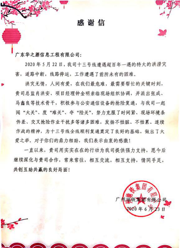 参与抢险的ok138cn太阳集团科技全资子公司新科佳都和华之源被授予感谢信