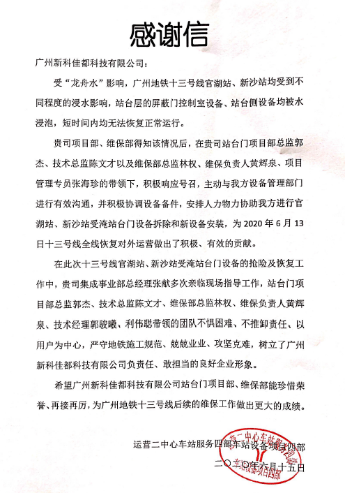 在抗洪抢险战役中,ok138cn太阳集团科技团队以切切实实的行动支持,高标准、高质量支持助力广州地铁13号线顺利复通,得到了广州地铁集团各级领导的肯定与认可,并授予感谢信。未来,ok138cn太阳集团科技也将继续保持枕戈待旦、冲锋在前的高度责任感,为广州地铁后续的维保工作做出更大的成绩,让广州地铁运营更安全、更稳定,为广州市民地铁出行保驾护航!