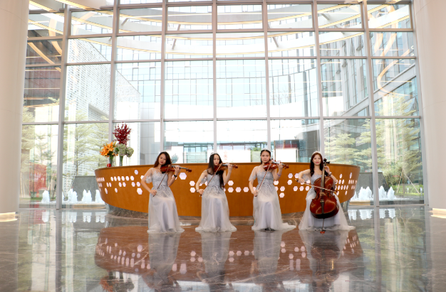 庆典仪式之后,在新总部一楼的中庭广场,热闹的员工庆祝酒会开始了。精美诱人的各式西点、五颜六色的鸡尾酒等特饮供应,悠扬的小提琴演奏乐、古筝乐表演醉人心弦,员工们在欢声笑话、美酒佳肴中分享着对新总部迁入的喜悦,珍惜着这个可以让大家欢乐交流与畅饮的好机会。